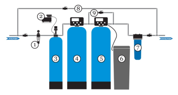 - Обводная линия умягчителя - необходима для регулирования уровня жесткости поступающей воды